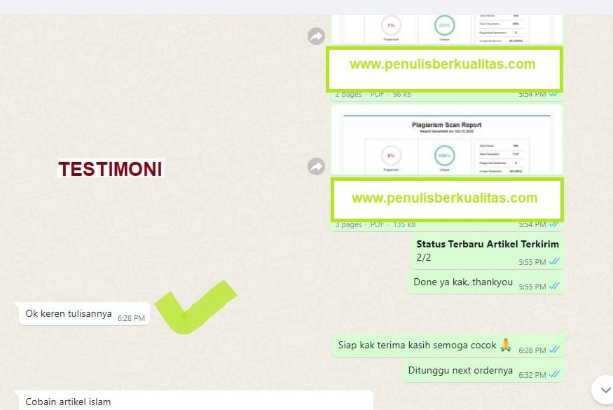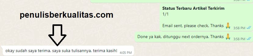 Kami adalah jasa penulis artikel bergaransi. Apabila memang ada yang kurang kamu suka dari artikel atau tidak memenuhi kriteria yang kamu minta. Maka kamu bisa request garansi. Nanti team kami akan merevisi dengan seksama. Tetapi sejauh ini client kami selalu puas dengan artikel yang dibuat karena memang content writer yang menulis semuanya berpengalaman dan lolos 100% plagiarism.