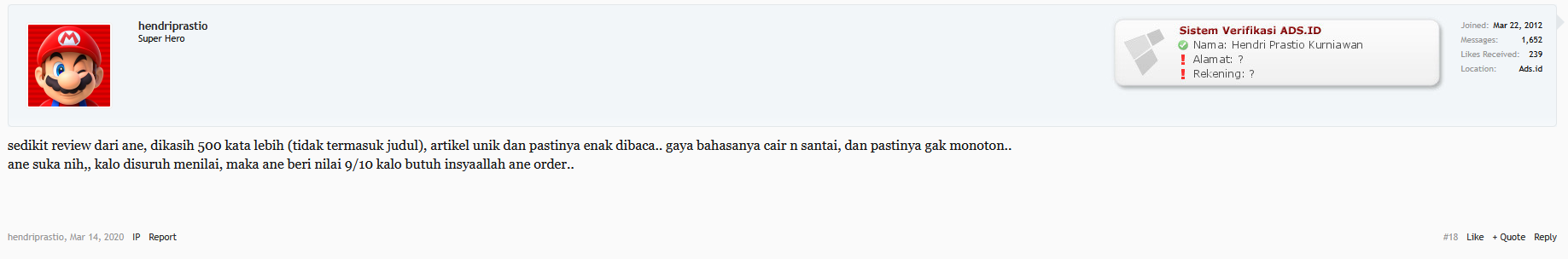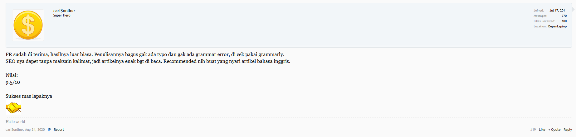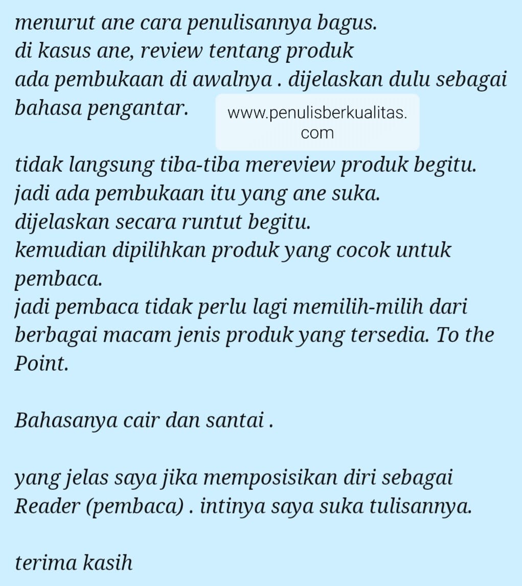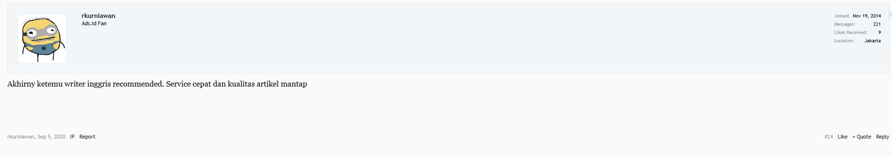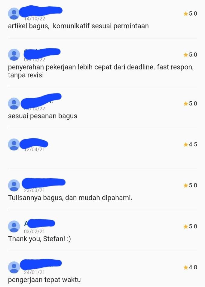 Jadi penting sekali untuk meluangkan waktu mencari yang memang berkualitas. Jangan percaya kalau ada yang menuliskan jasa penulis artikel terbaik. Kamu harus melihat review dari client yang sudah pernah meminta dibuatkan artikel oleh content writer tersebut. Apalagi untuk urusan artikel Inggris, harus yang memang bisa grammar writernya, bukan writer asal-asalan.